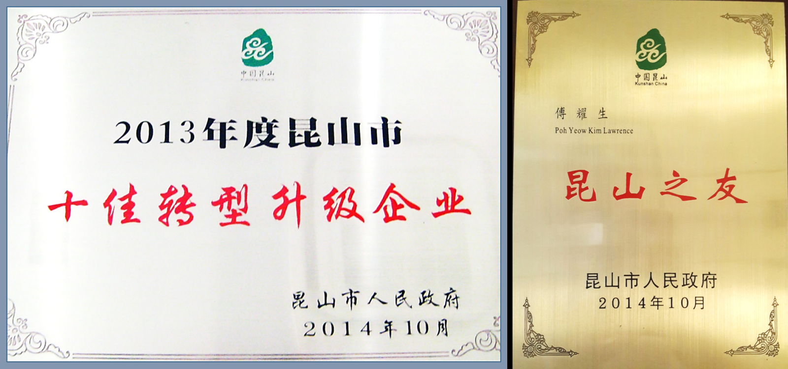 2014年10月11日上午,由昆山市政府主办的2013年度授牌仪式在昆山市政大厅举行,旨在表彰2013年度对昆山经济发展、绿色发展和人文发展做出杰出贡献的企业和个人。金年会·jinnian(金子招牌)信誉至上机械受邀参加并接受政府颁发的两个奖项。 2013年度“十佳转型升级企..